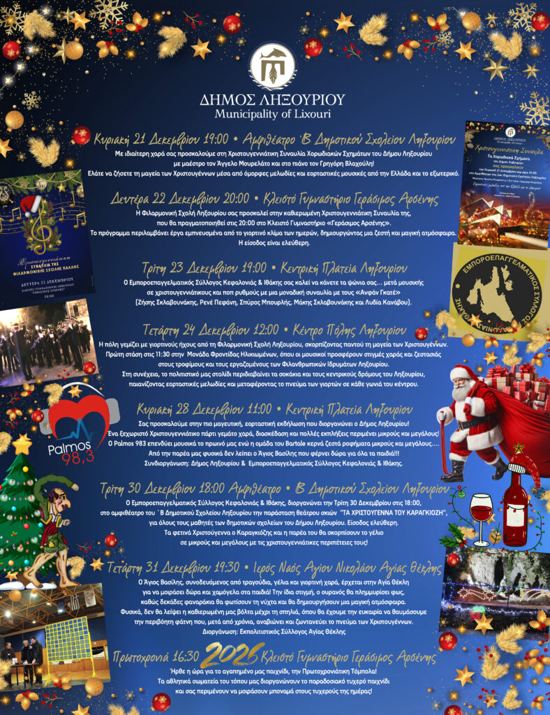 Με ένα πλούσιο και πολυδιάστατο πρόγραμμα πολιτιστικών και εορταστικών δράσεων, ο Δήμος Ληξουρίου προσκαλεί μικρούς και μεγάλους να ζήσουν τη μαγεία των Χριστουγέννων και της Πρωτοχρονιάς στην πόλη.