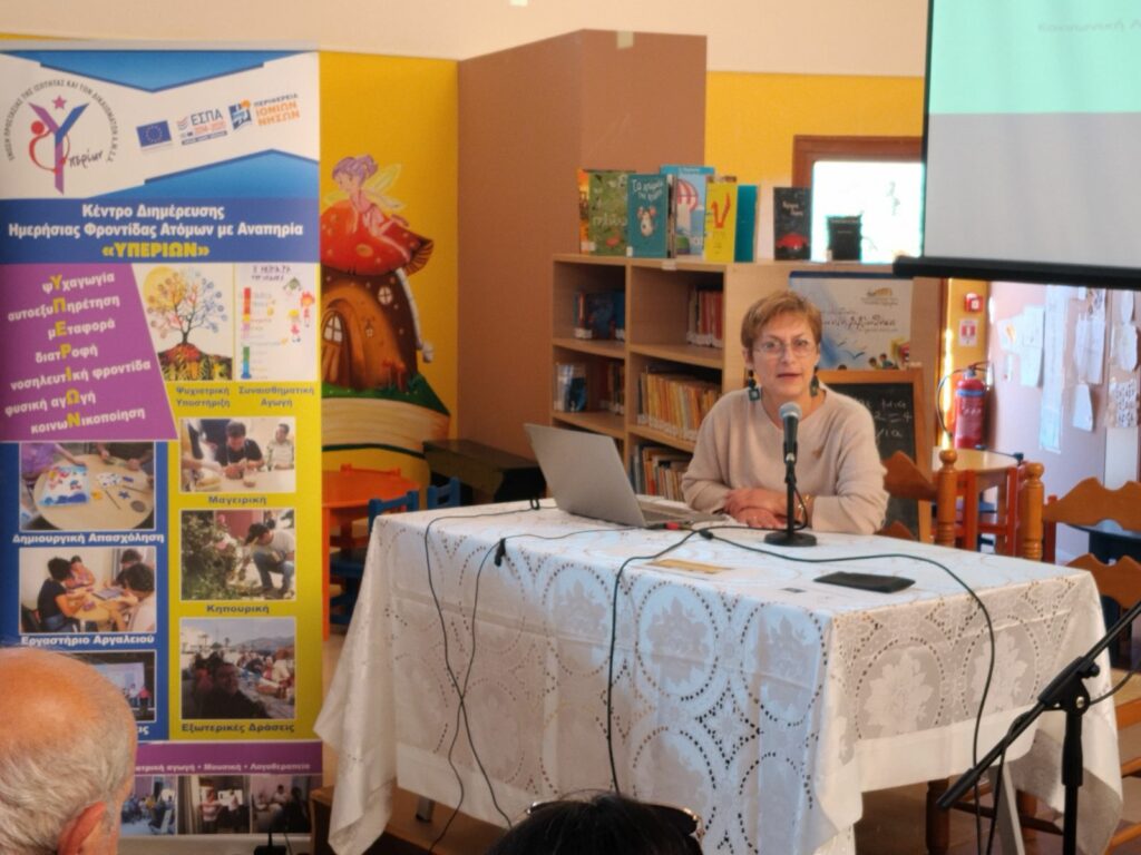 θέμα του αυτισμού, της αποδοχής και της συνύπαρξης. Κατά την πρώτη θεματική ενότητα, με θέμα τον αυτισμό και εισηγήτρια την κοινωνική λειτουργό της Ένωσης ΑμεΑ ΥΠΕΡΙΩΝ, κυρία Εύα Αλεξανδράτου, αναδείχθηκε η σημασία της κατανόησης αποδοχής και της ισότιμης συμμετοχής στην κοινωνία μας των ατόμων στο φάσμα του αυτισμού.. Αξίζει να σταθούμε στην μοναδική κι ευαίσθητη απαγγελία του ποιήματος «Στο Φάσμα της Ψυχής» που απήγγειλε ο κύριος Γεράσιμος Λεγάτος, ο οποίος κατάφερε να συγκινήσει κάθε παρευρισκόμενο.