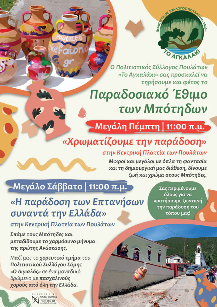 Ο Πολιτιστικός Σύλλογος Πουλάτων «Το Αγκαλάκι» σας προσκαλεί για τρίτη συνεχή χρονιά να ζωντανέψουμε μία από τις πιο όμορφες παραδόσεις της Κεφαλλονιάς και των Επτανήσων. Το έθιμο των μπότηδων.