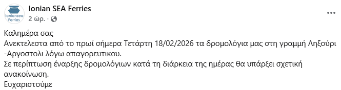 Τη διακοπή των δρομολογίων στη γραμμή Ληξούρι – Αργοστόλι για σήμερα Τετάρτη 18 Φεβρουαρίου 2026 ανακοίνωσε η Ionian SEA Ferries, ενημερώνοντας το επιβατικό κοινό για αλλαγές στο πρόγραμμα.