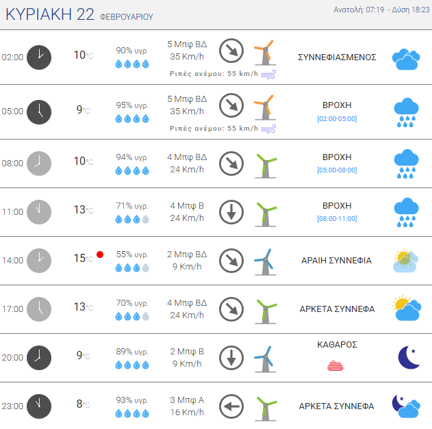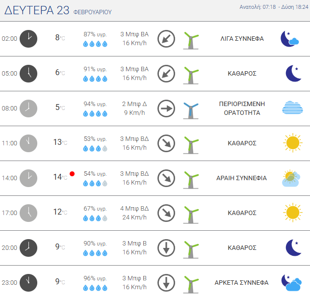 Τη Δευτέρα 23 Φεβρουαρίου ο καιρός θα είναι γενικά καλός. Νωρίς το πρωί θα επικρατήσει λίγη συννεφιά και κατά τόπους περιορισμένη ορατότητα, όμως από τις προμεσημβρινές ώρες θα επικρατήσει ηλιοφάνεια με αραιές νεφώσεις κατά διαστήματα. Οι άνεμοι θα πνέουν από βόρειες διευθύνσεις 2–4 μποφόρ, ενισχυόμενοι το απόγευμα έως 4 μποφόρ, ενώ η θερμοκρασία θα κυμανθεί περίπου από 5°C έως 14°C. Το βράδυ θα παραμείνει κυρίως αίθριος με λίγες νεφώσεις.