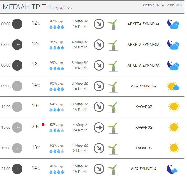 Τη Μεγάλη Τρίτη επικρατεί αρχικά αυξημένη συννεφιά και πολύ υψηλά ποσοστά υγρασίας τις πρωινές ώρες, όμως από το μεσημέρι ο καιρός βελτιώνεται αισθητά με ηλιοφάνεια και καθαρό ουρανό. Η θερμοκρασία σημειώνει άνοδο, φτάνοντας έως τους 20 βαθμούς.