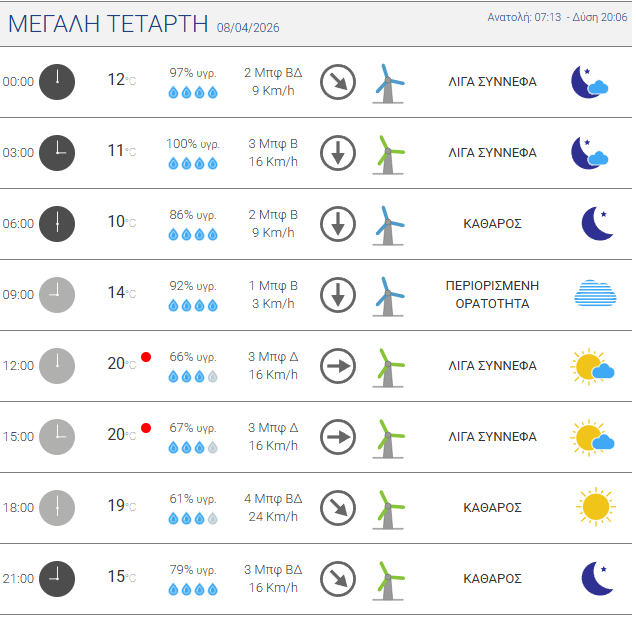 Τη Μεγάλη Τετάρτη η ημέρα ξεκινά με λίγες νεφώσεις και τοπικά περιορισμένη ορατότητα το πρωί, ενώ στη συνέχεια επικρατεί ηλιοφάνεια με ήπιες καιρικές συνθήκες. Η θερμοκρασία παραμένει σταθερή, με μικρές διακυμάνσεις.