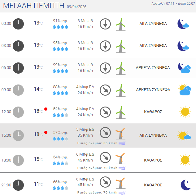 Τη Μεγάλη Πέμπτη παρατηρούνται εναλλαγές συννεφιάς και ηλιοφάνειας, με τον καιρό να διατηρείται γενικά καλός. Ωστόσο, οι άνεμοι ενισχύονται αισθητά από το μεσημέρι και μετά, φτάνοντας κατά τόπους σε ισχυρές εντάσεις.