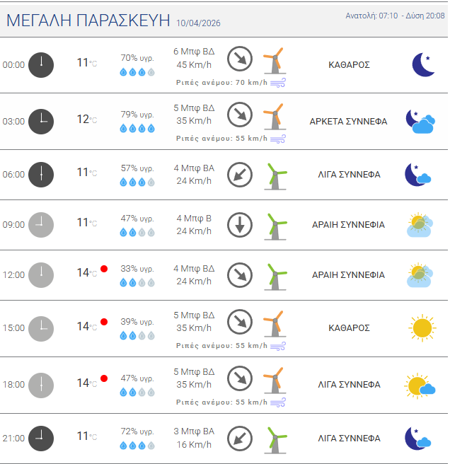 Τη Μεγάλη Παρασκευή ο καιρός παραμένει κυρίως αίθριος με αραιές νεφώσεις κατά διαστήματα. Οι άνεμοι εξακολουθούν να είναι ενισχυμένοι, ιδιαίτερα τις πρωινές και απογευματινές ώρες, ενώ η θερμοκρασία σημειώνει μικρή πτώση.