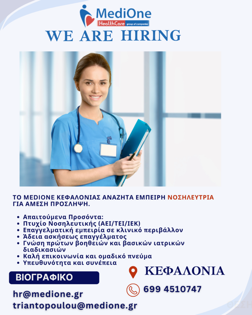 Το MediOne Κεφαλονιάς αναζητά έμπειρη Νοσηλεύτρια για άμεση πρόσληψη.